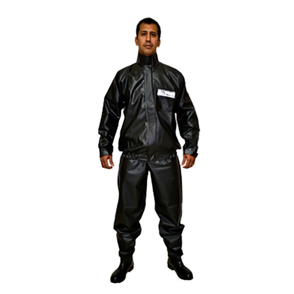 Conjunto De Chuva Confeccionado Em Pvc Forrado, Composto Por Blusão Com Fechamento Frontal Por Ziper E Velcro, Carcela De Proteção, Elástico Na Cintura, Ajuste Nos Punhos Por Velcro, Faixa Refletiva Prata Nas Costas E No Bolso Frontal. Calça Com Ajuste Na Cintura Por Elástico, Ziper Para Ajuste No Tornozelo E Faixa Refletiva Prata Ao Lado Do Ziper