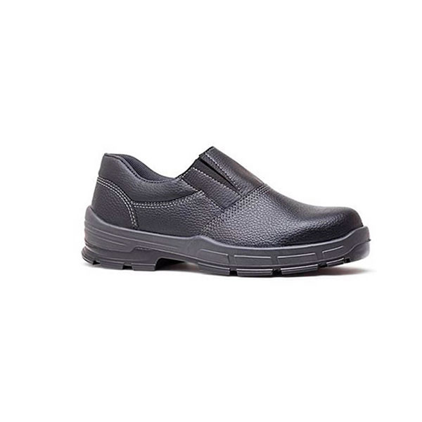 Sapato de proteção com fechamento em elástico frontal recoberto confeccionado em couro estampa relax preta, colarinho acolchoado, forração interna da gáspea, solado de poliuretano (PU) bidensidade e tecnologia AirTech; tecido composto por câmaras que proporcionam um melhor microclima interno e rápida secagem. 4045BSES4600LL Linha Plus CA 42239.